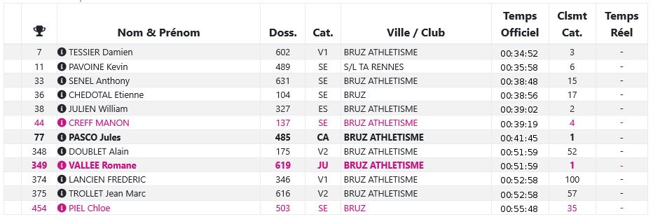 Pour cette édition des foulées de Domloup, plus de 700 participants au départ dont 9 athlètes de Bruz athlétisme. Nos champions ont fait preuve d’efficacité avec 2 victoires et 2 podiums et des places d’honneur. Chez les femmes le niveau était très relevé, Manon Creff vient prendre une belle 4ème place avec un chrono de 39’19 », Romane Vallée avec son meneur d’allure Alain Doublet réalise un joli coup pour son premier 10km en 51’59 »: Première course, première victoire en JUF.
