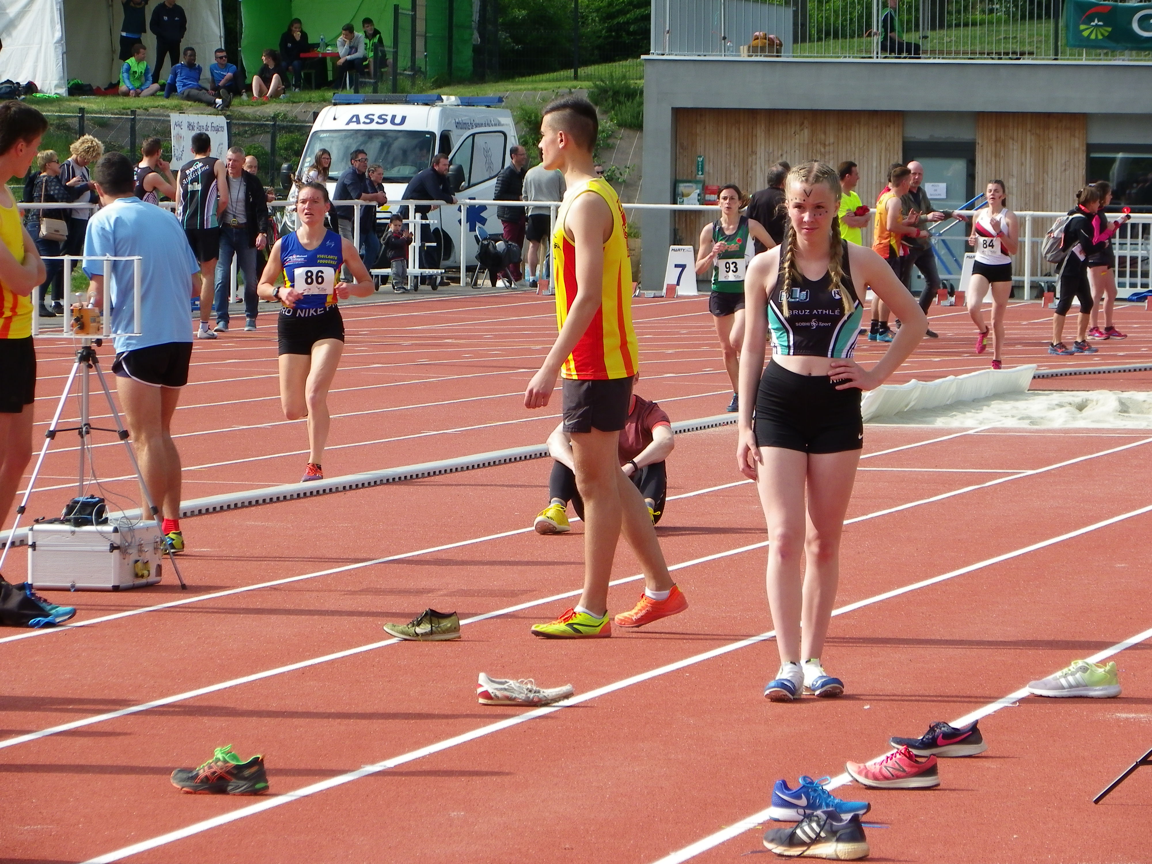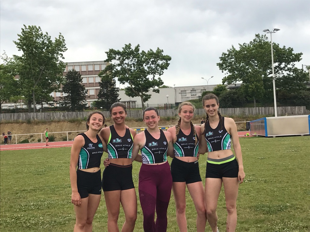 Nous y sommes, après les interclubs, les premiers championnats se mettent en place. Le championnat départemental se déroulait sur le stade de Montfort sur Meu. Sous une chaleur estivale, le club de Bruz présentait ses athlètes dans les catégories cadets(ttes), juniors et espoirs. Agathe Vallée, échoue au pied du podium avec une belle 4ème place au concours du saut en hauteur. Des records club sont tombés, Elise Le Corre sur le 100m avec un chrono de 13″83 ( ancien record 16″53) et sur le 200m en 29″03 (ancien record 29″69). Record club également pour le relais 4x100m ESF avec un chrono de 53″91, relais composé de : Laura Lefranc/Agathe Vallée/Aurore Judais/Elise Le Corre. Bravo aux filles de Thierry, toujours présentes sur les stades du département.