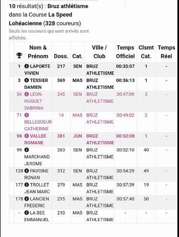 Nos Bruzoises ont brillées également avec Sabrina Léon-Huguet 3ème en 47’09, Catherine Bellesoeur 2ème en VEF en 49’02 » et Romane Vallée accompagnée de son garde du corps de qualité Jérome Marchand termine 1ère JUF en 52’08.