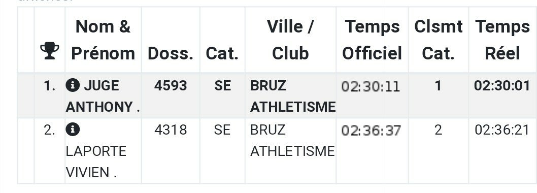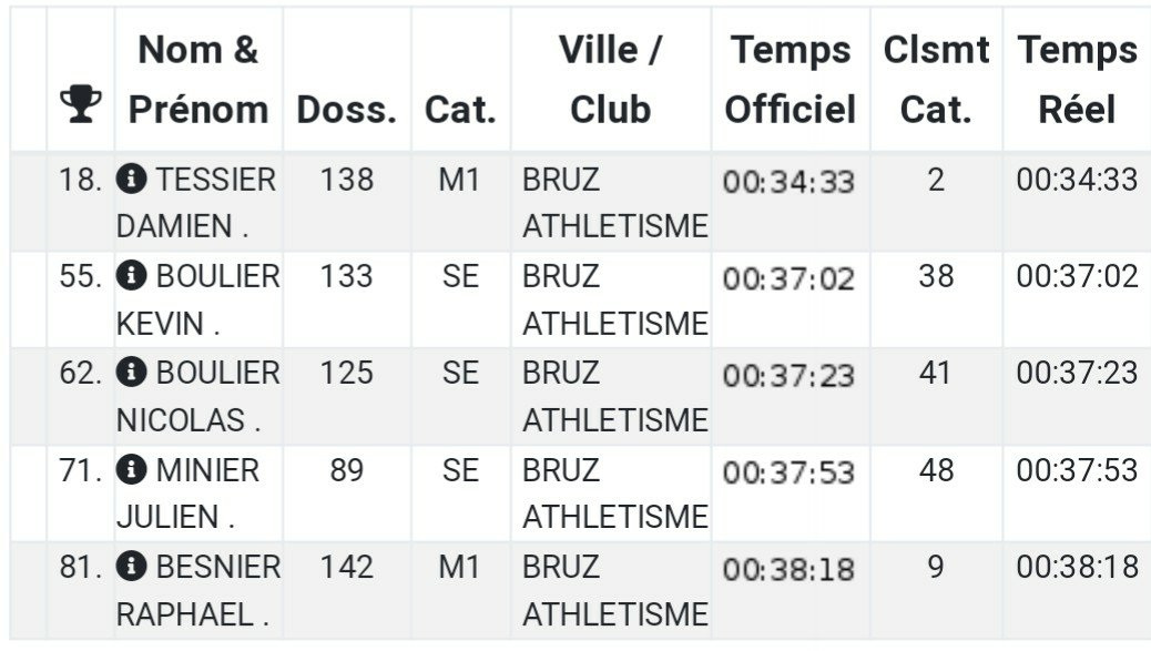 Sur le 10km, tir groupé des athlètes du club avec Damien Tessier 18ème (2ème V1H) en 34’33 », Kévin Boulier 55 ème en 37’02 », Nicolas Boulier 62 ème en 37’23 », Julien Minier 71 ème en 37’53 » et Raphaël BESNIER 81 ème (9ème V1H) en 38’18 ». Bravo à tous. #Bruzathle 💚 🖤