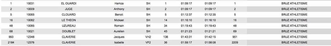 Sur le semi Ouest France, magnifique doublé d’Hamza El Ouardi et Anthony Jugé qui occupent les deux premières places dans le même temps (1h09’17), la belle place d’honneur de Benoit Clouard qui après une remontée magnifique vient chercher sur cette épreuve une belle 5ème place en 1h12’35. On notera la belle 14eme place de Michael Le Theon en 1h16’10, la 34eme place de Romain Uzureau en 1h19,43, Aurélien Doublet 45eme en 1h21’21, Jacques Claverie VH2 138eme en 1h42’15 et Isabelle Claverie VF2 36eme en 1h58’08.