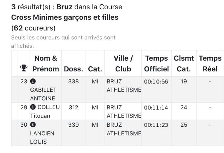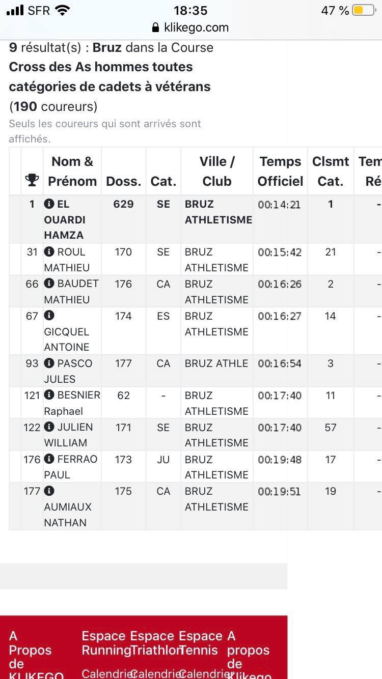 Des résultats prometteurs pour les athlètes de Bruz à l’amorce de la saison de cross 2019/2020. Sur un terrain très gras, l’equipe des seniors de Bruz réalise une belle prestation avec des places d’honneurs et la magnifique victoire d’Hamza. Chez les cadets un joli podium vert et noir avec une 2ème place pour Mathieu Baudet et Jules Pascal 3ème. Chez les minimes joli tir groupé de nos jeunes athlètes Antoine, Titouan et Louis. Bravo à tous, la saison cross démarre plein pot!!🏆🥇🥈🥉💚🖤