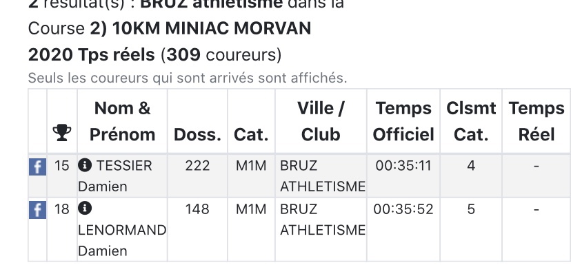 - 15ème place pour Damien Tessier et 18ème place pour Damien Lenormand au 10km de Miniac Morvan 35’11 et 35″52