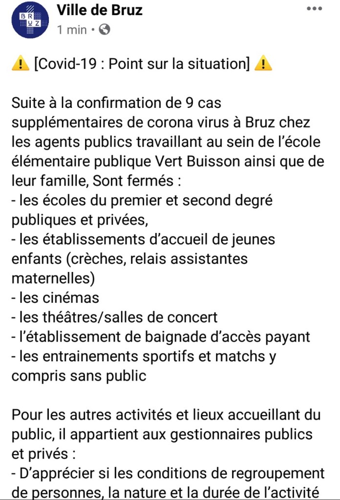 Suite à la présence de 9 personnes contaminées par le Coronavirus sur la ville de Bruz, toutes les manifestations, rencontres, entraînements sportifs etc… sont suspendus.