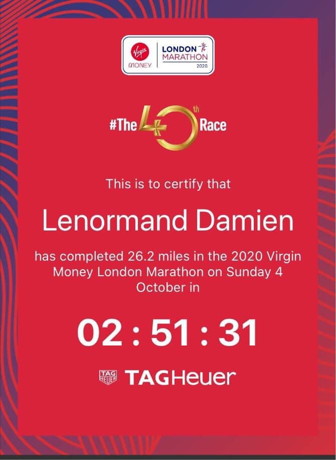 Marathon de Londres en virtuel de Damien Lenormand ! 2h50’32 bravo Damien pr cette performance et merci à William Julien et Anthony Senel d’avoir accompagné Damien sur une partie du parcours 🖤💚👍👌💪👏👏