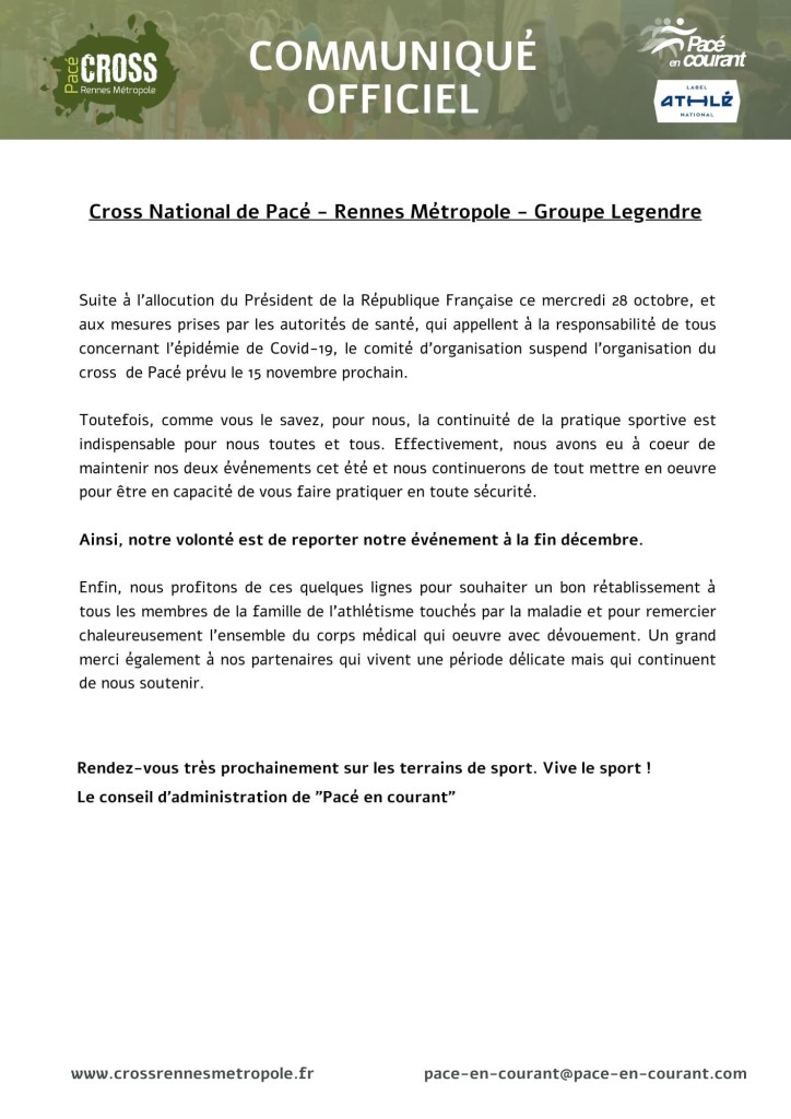 Info cross de Pacé Publié le 29 octobre 20202 novembre 2020 par basiteweb Partager : Partager sur X(ouvre dans une nouvelle fenêtre) X Partager sur Facebook(ouvre dans une nouvelle fenêtre) Facebook J’aime chargement…