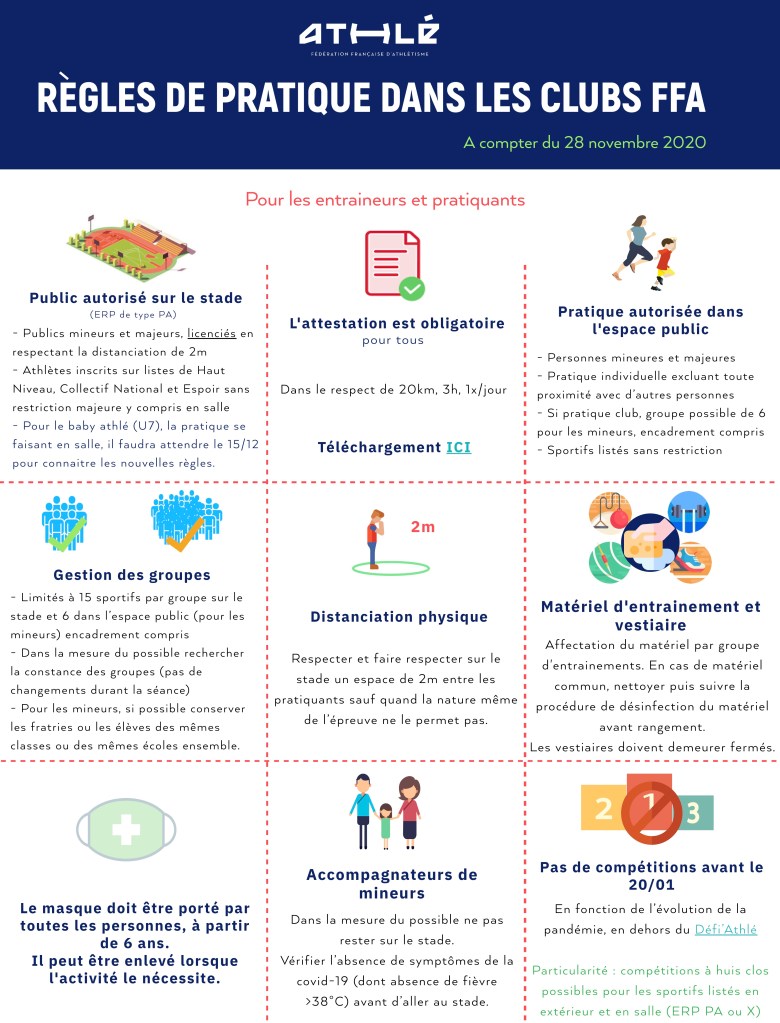 Toutefois, pour éviter un trop grand nombre d’athlètes sur le site du COSEC, nous allons autoriser dans la première phase du déconfinement (28/11 au 15/12) l’accès au stade uniquement aux mineurs. Donc pour les mineurs reprise des entraînements au stade ce mercredi 3 décembre 2020.