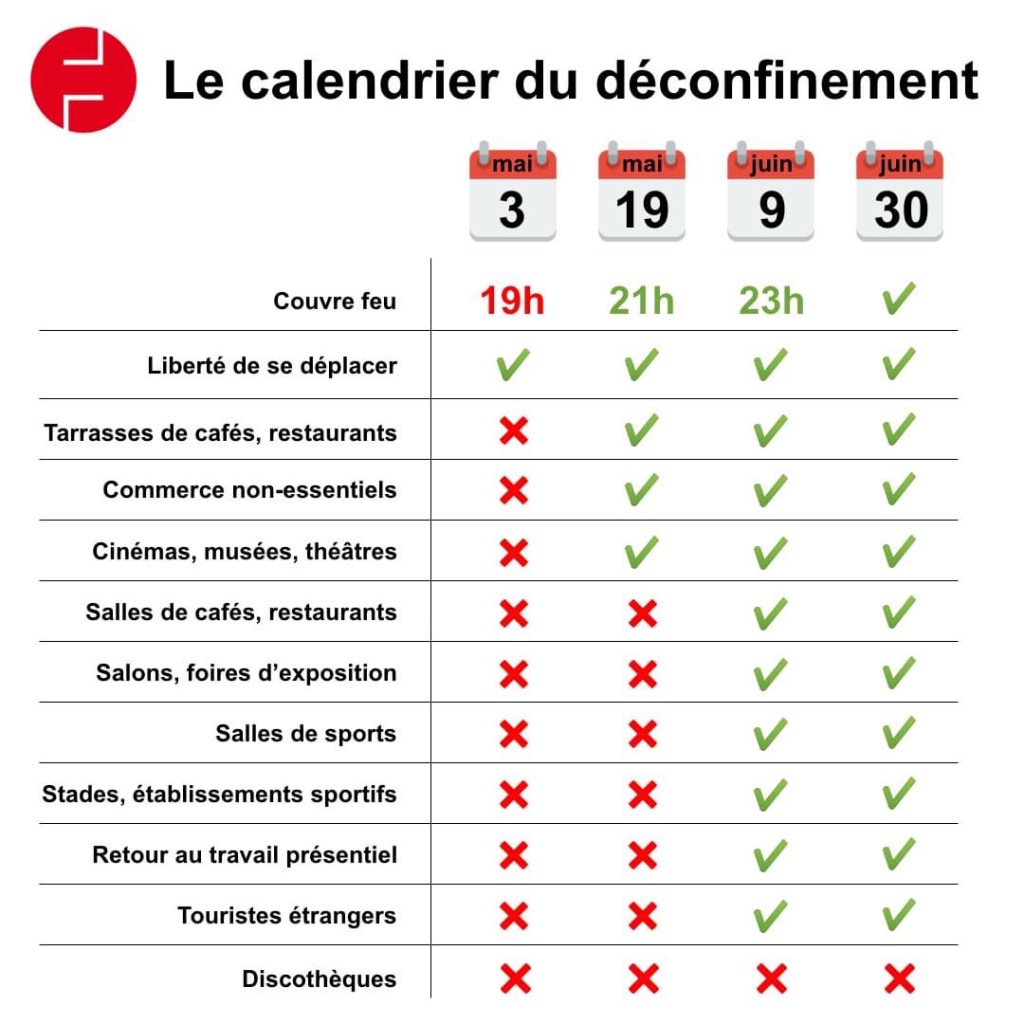 Infos sur les différentes étapes du déconfinement. Publié le 30 avril 20213 Mai 2021 par basiteweb Tableau récapitulatif édité par nos amis d’Ouest France sur les différentes étapes du déconfinement. Partager : Partager sur X(ouvre dans une nouvelle fenêtre) X Partager sur Facebook(ouvre dans une nouvelle fenêtre) Facebook J’aime chargement…