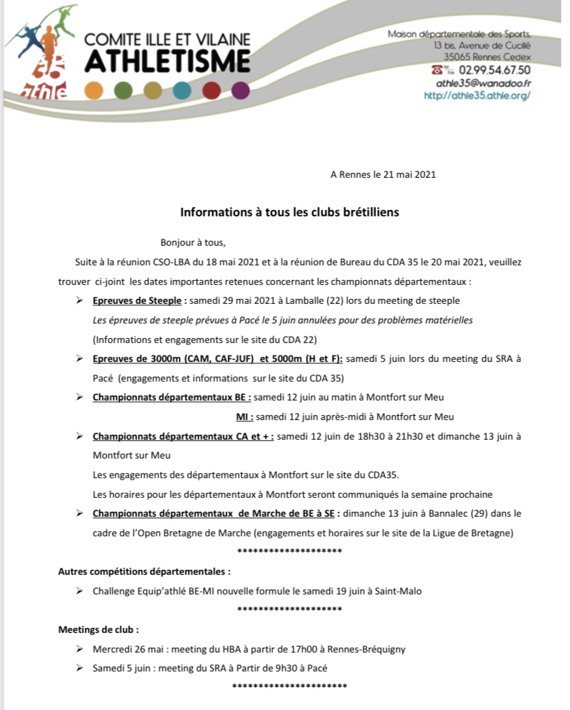 Infos sur le programme de reprise des meetings(35) et championnats départementaux… Publié le 22 Mai 202122 Mai 2021 par basiteweb Ça sent la reprise…👍 Partager : Partager sur X(ouvre dans une nouvelle fenêtre) X Partager sur Facebook(ouvre dans une nouvelle fenêtre) Facebook J’aime chargement…