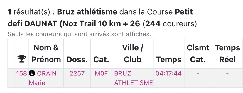 22ème place F pour Marie Orain sur le petit défi (10km de nuit et 26km le lendemain). Bravo pour ton résultat. Bonne récup