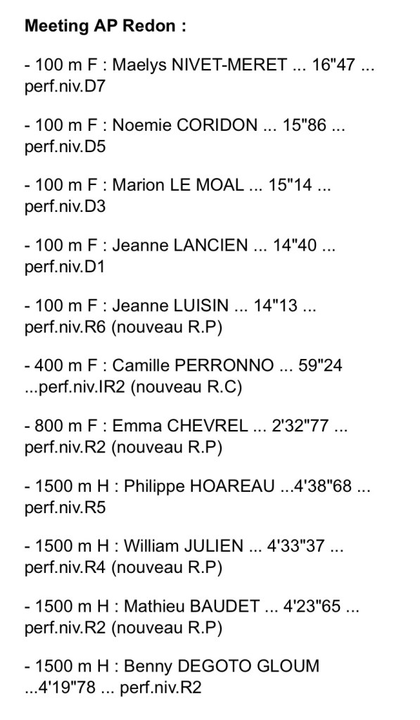 Meeting Pays de Redon les perfs et les résultats.