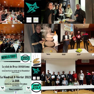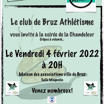 Le vendredi 4 février 2022 à 20h à la maison des associations de la ville de Bruz, le club de Bruz athlétisme organise une soirée sur le thème de la Chandeleur, galette et crêpes à volonté…. Chers adhérents, nous comptons sur votre présence… Les conjointes, conjoints et enfants sont les bienvenus. Lors de cette soirée, … Lire la suite Soirée Bruz athlétisme le vendredi 4 février à 20h